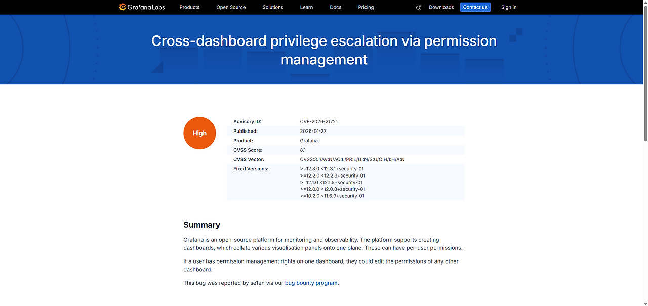 - CVE-2026-21721 | CVSS 8.1 / Privilege Escalation in grafana | (Bounty Awarded)